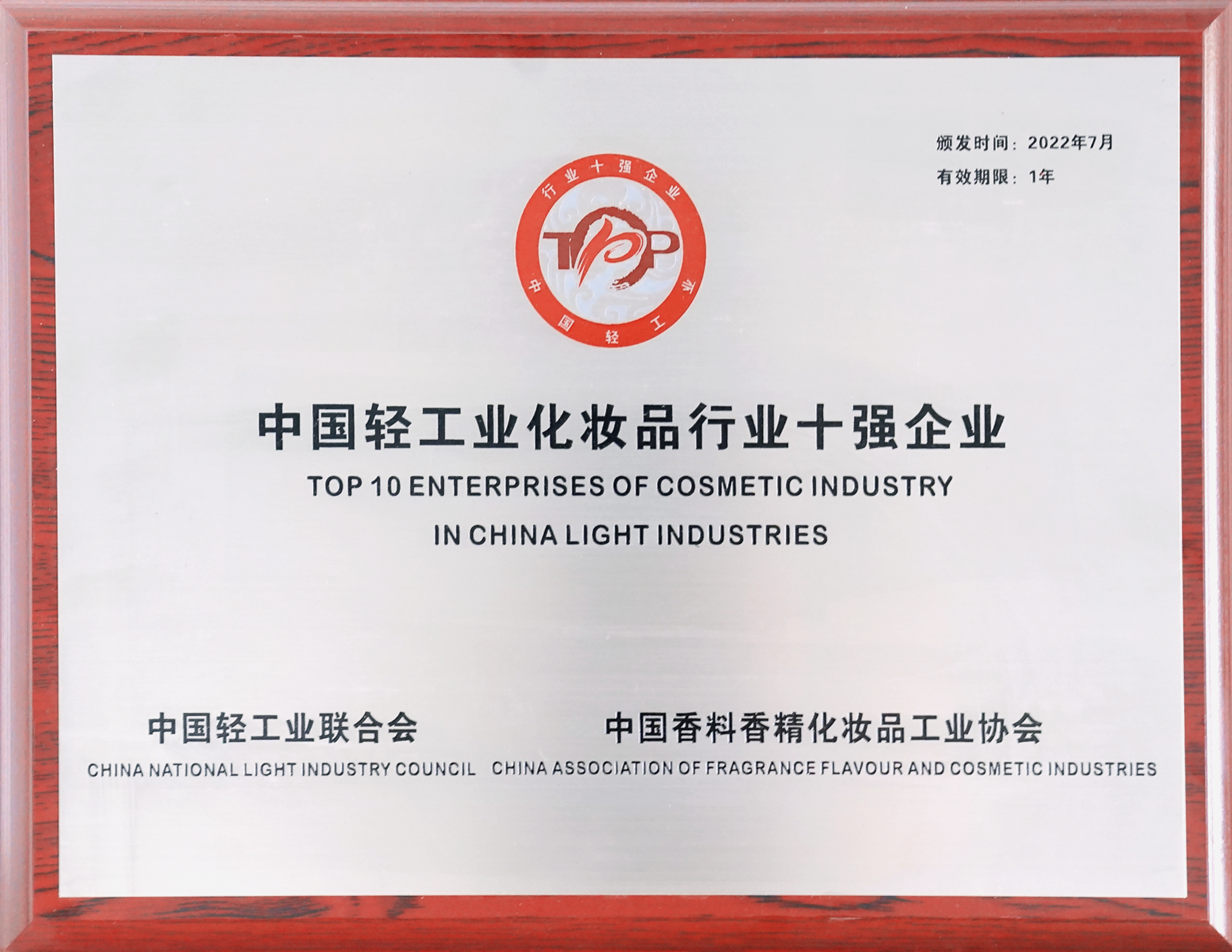喜讯!尊龙凯时家化荣获中国轻工业化妆品行业十强企业